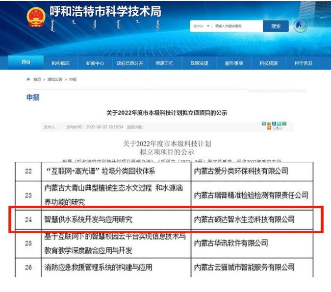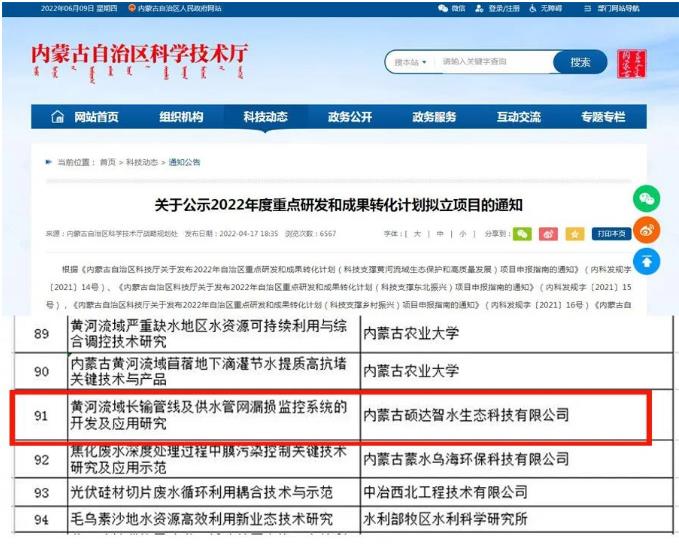 碩達智水作為水生態(tài)領(lǐng)域高新技術(shù)企業(yè),科研創(chuàng)新是企業(yè)發(fā)展第一驅(qū)動力,公司水生態(tài)研究院一直專注于新技術(shù)、新產(chǎn)品的研究探索。近期,內(nèi)蒙古自治區(qū)科學(xué)技術(shù)廳發(fā)布“關(guān)于公示2022年度重點研發(fā)和成果轉(zhuǎn)化計劃擬立項目的通知”,與呼和浩特市科學(xué)技術(shù)局發(fā)布“關(guān)于2022年度市本級科技計劃擬立項項目的公示”碩達智水兩大科研項目名列其中。